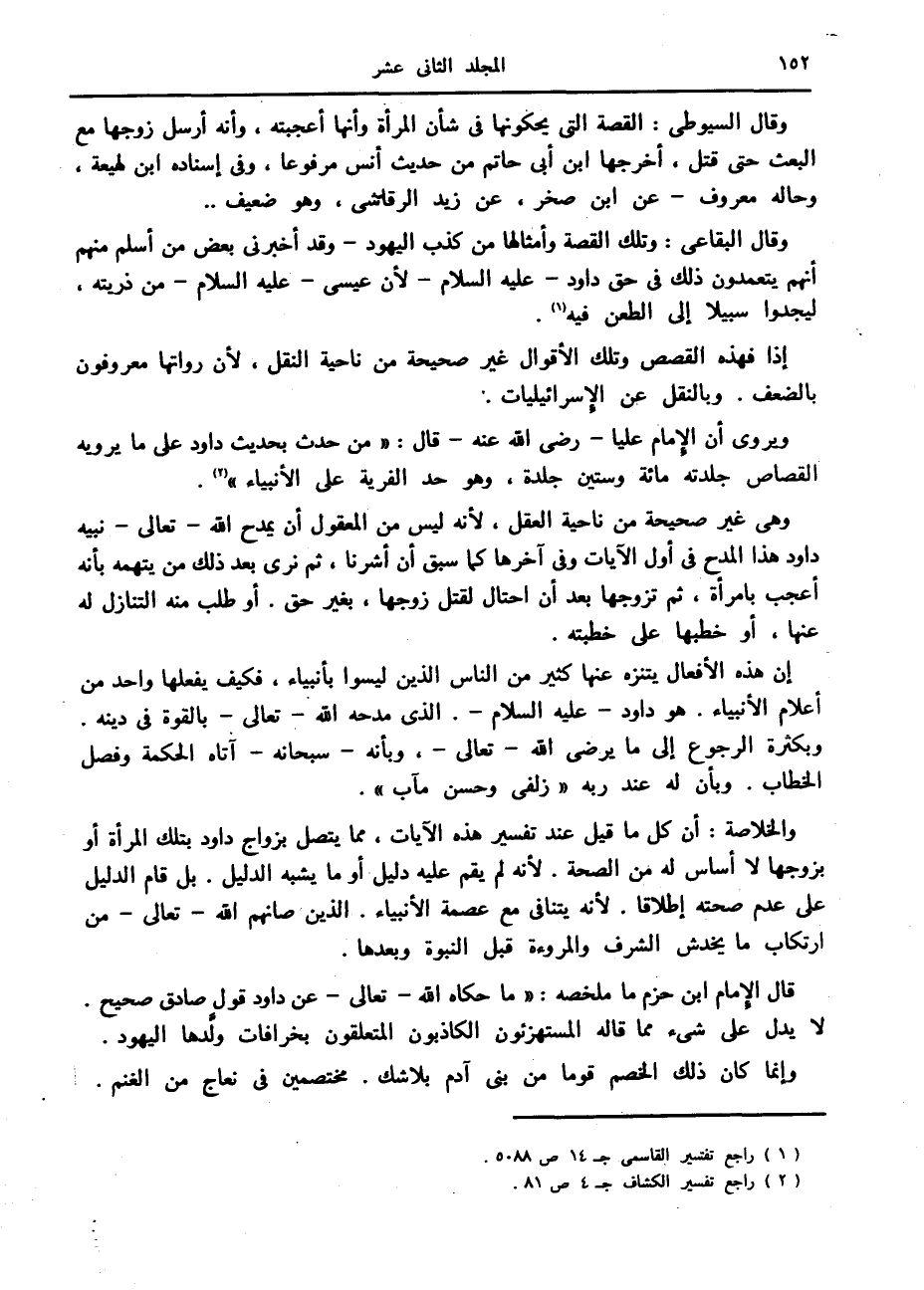 ويروى أن الإمام عليا- رضى الله عنه- قال: «من حدث بحديث داود على ما يرويه القصاص جلدته مائة وستين جلدة، وهو حد الفرية على الأنبياء» «2» .