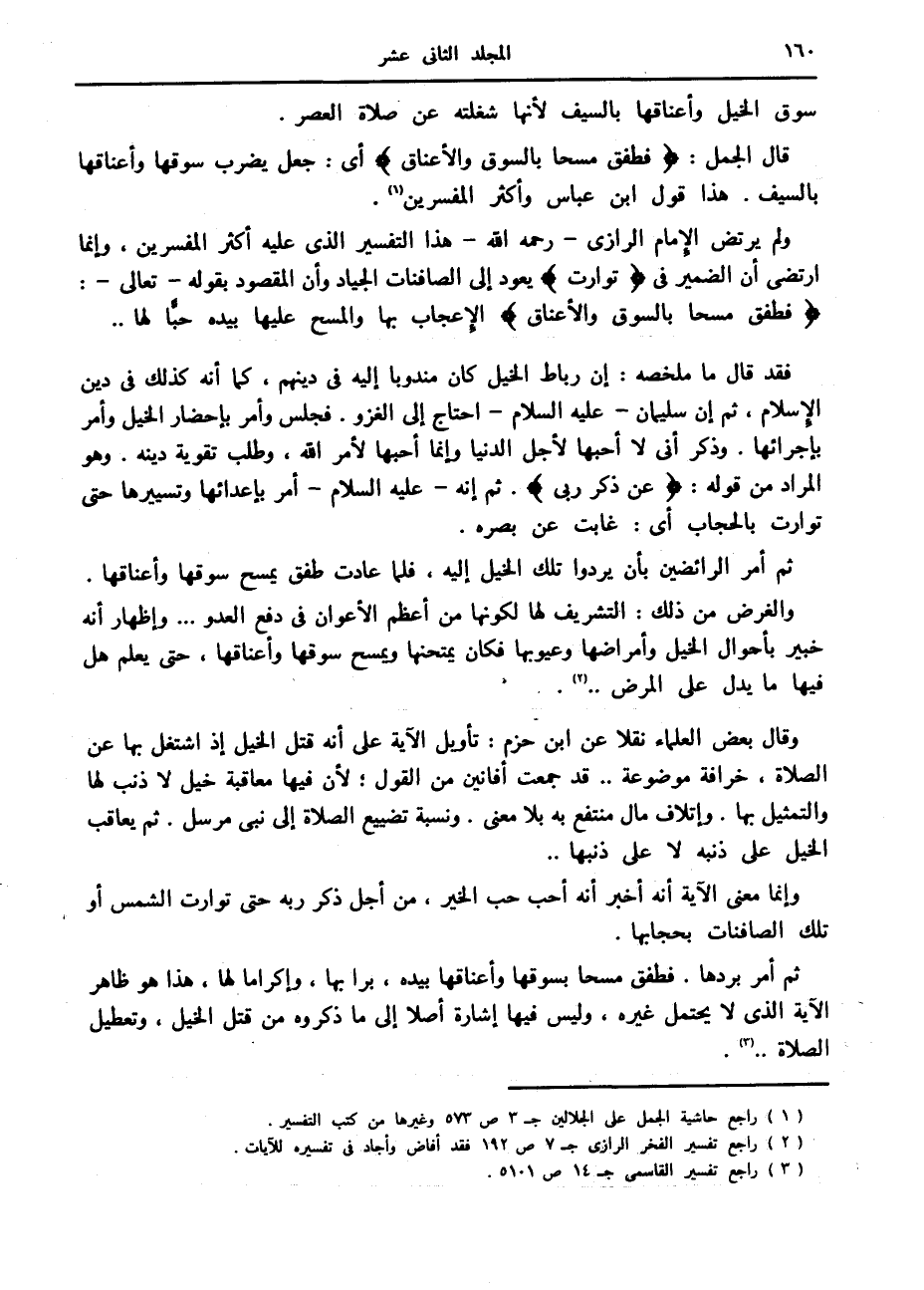 ثم أمر بردها. فطفق مسحا بسوقها وأعناقها بيده، برابها، وإكراما لها، هذا هو ظاهر الآية الذي لا يحتمل غيره، وليس فيها إشارة أصلا إلى ما ذكروه من قتل الخيل، وتعطيل الصلاة.. «3» .