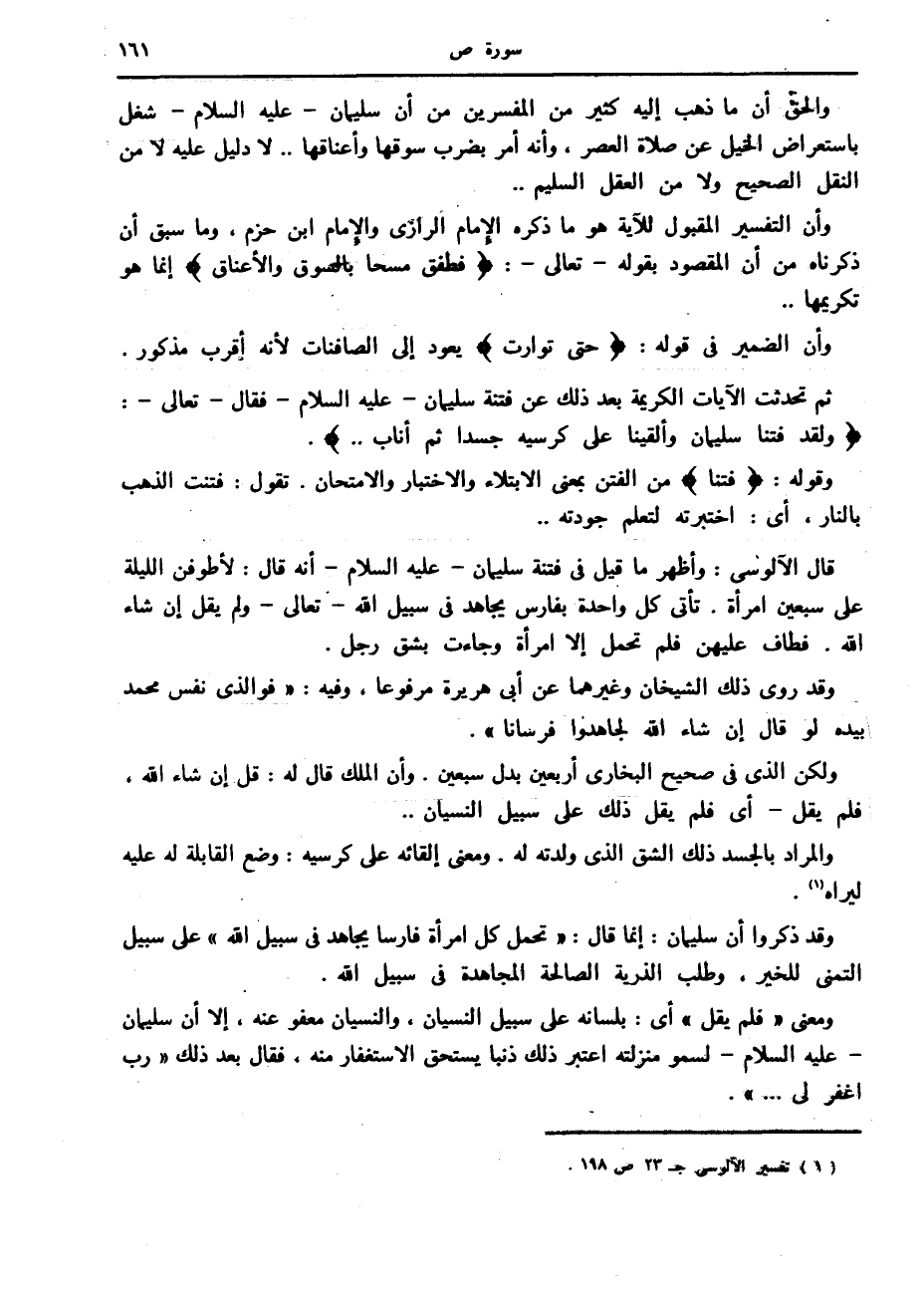والحق أن ما ذهب إليه كثير من المفسرين من أن سليمان- عليه السلام- شغل باستعراض الخيل عن صلاة العصر، وأنه أمر بضرب سوقها وأعناقها.. لا دليل عليه لا من النقل الصحيح ولا من العقل السليم..