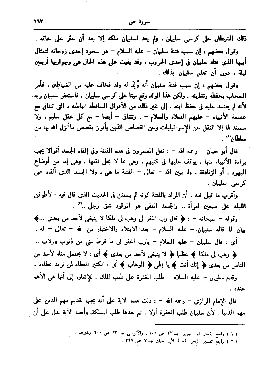وقول بعضهم: إن سبب فتنة سليمان أنه ولد له ولد فخاف عليه من الشياطين، فأمر السحاب بحفظه وتغذيته. ولكن هذا الولد وقع ميتا على كرسي سليمان، فاستغفر سليمان ربه لأنه لم يعتمد عليه في حفظ ابنه. إلى غير ذلك من الأقوال الساقطة الباطلة، التي تتنافى مع عصمة الأنبياء- عليهم الصلاة والسلام-. وتتنافى- أيضا- مع كل عقل سليم، ولا مستند لها إلا النقل عن الإسرائيليات وعن القصاص الذين يأتون بقصص ما أنزل الله بها من سلطان «1» .