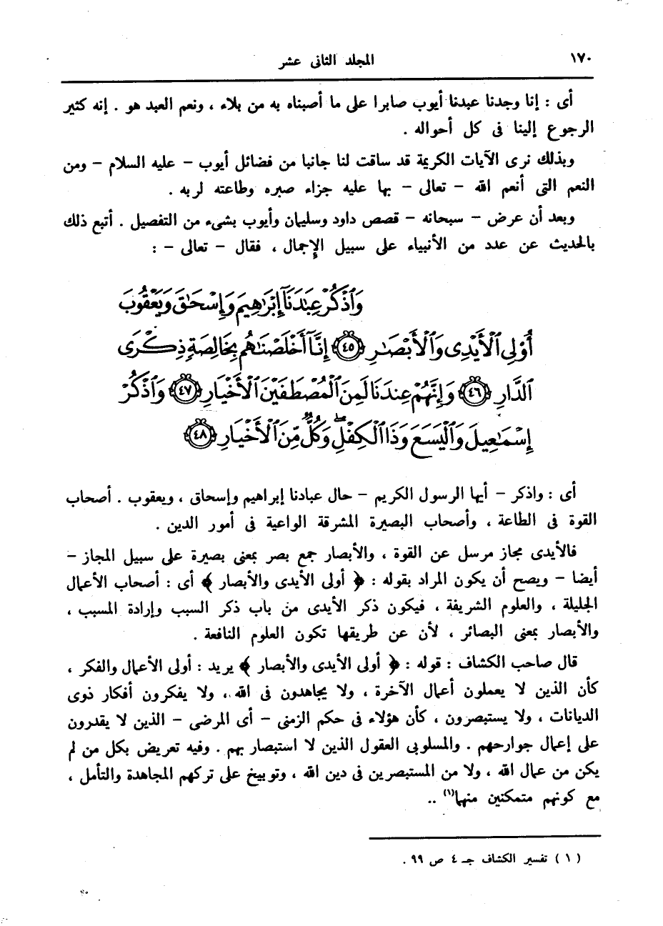 أى: واذكر- أيها الرسول الكريم- حال عبادنا إبراهيم وإسحاق، ويعقوب. أصحاب القوة في الطاعة، وأصحاب البصيرة المشرقة الواعية في أمور الدين.