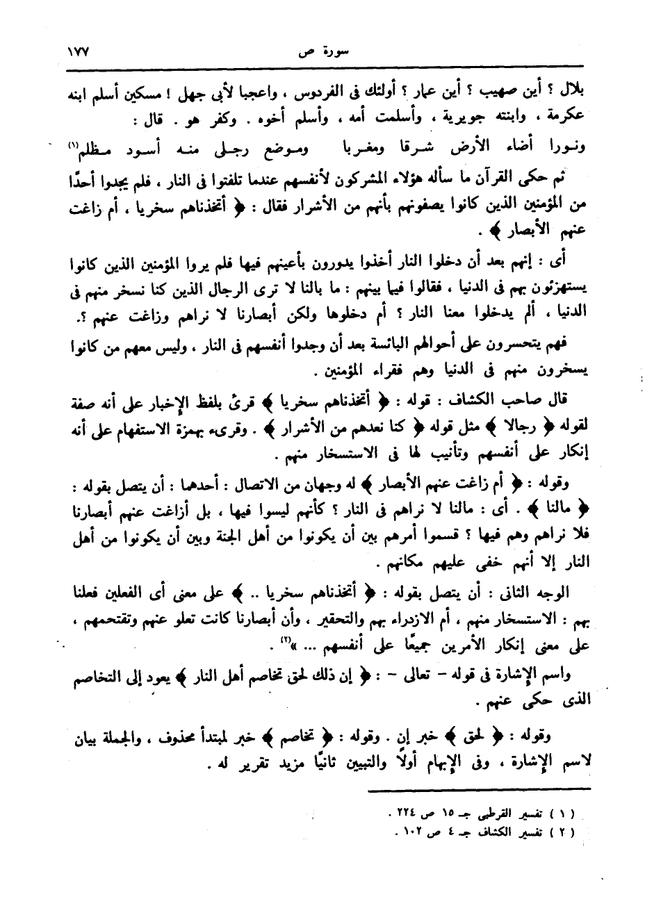 الوجه الثاني: أن يتصل بقوله: أَتَّخَذْناهُمْ سِخْرِيًّا ... على معنى أى الفعلين فعلنا بهم: الاستسخار منهم، أم الازدراء بهم والتحقير، وأن أبصارنا كانت تعلو عنهم وتقتحمهم، على معنى إنكار الأمرين جميعا على أنفسهم ... » «2» .