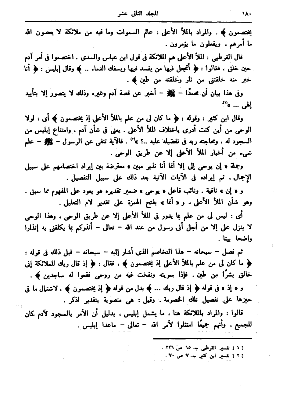 وقال ابن كثير: وقوله: ما كانَ لِي مِنْ عِلْمٍ بِالْمَلَإِ الْأَعْلى إِذْ يَخْتَصِمُونَ أى: لولا الوحى من أين كنت أدرى باختلاف الملأ الأعلى. يعنى في شأن آدم، وامتناع إبليس من السجود له، ومحاجته ربه في تفضيله عليه..؟» «2» . فالآية تنفى عن الرسول صلّى الله عليه وسلم علم شيء من أخبار الملأ الأعلى إلا عن طريق الوحى.
