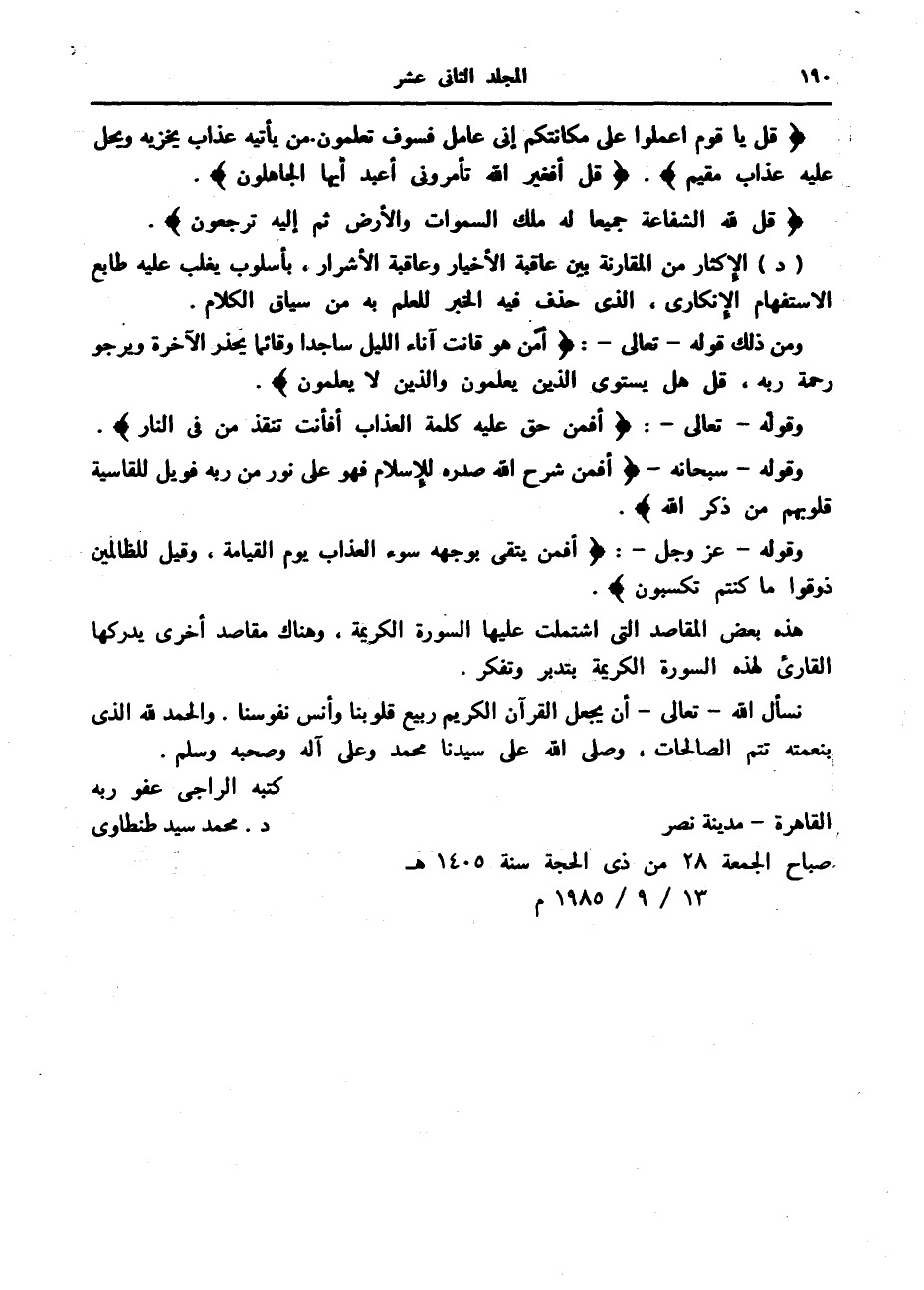 كتبه الراجي عفو ربه القاهرة- مدينة نصر د. محمد سيد طنطاوى صباح الجمعة 28 من ذي الحجة سنة 1405 هـ 13/ 9/ 1985 م