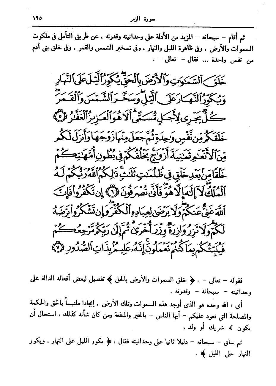 خَلَقَ السَّماواتِ وَالْأَرْضَ بِالْحَقِّ يُكَوِّرُ اللَّيْلَ عَلَى النَّهارِ وَيُكَوِّرُ النَّهارَ عَلَى اللَّيْلِ وَسَخَّرَ الشَّمْسَ وَالْقَمَرَ كُلٌّ يَجْرِي لِأَجَلٍ مُسَمًّى أَلا هُوَ الْعَزِيزُ الْغَفَّارُ (5) خَلَقَكُمْ مِنْ نَفْسٍ واحِدَةٍ ثُمَّ جَعَلَ مِنْها زَوْجَها وَأَنْزَلَ لَكُمْ مِنَ الْأَنْعامِ ثَمانِيَةَ أَزْواجٍ يَخْلُقُكُمْ فِي بُطُونِ أُمَّهاتِكُمْ خَلْقاً مِنْ بَعْدِ خَلْقٍ فِي ظُلُماتٍ ثَلاثٍ ذلِكُمُ اللَّهُ رَبُّكُمْ لَهُ الْمُلْكُ لا إِلهَ إِلاَّ هُوَ فَأَنَّى تُصْرَفُونَ (6) إِنْ تَكْفُرُوا فَإِنَّ اللَّهَ غَنِيٌّ عَنْكُمْ وَلا يَرْضى لِعِبادِهِ الْكُفْرَ وَإِنْ تَشْكُرُوا يَرْضَهُ لَكُمْ وَلا تَزِرُ وازِرَةٌ وِزْرَ أُخْرى ثُمَّ إِلى رَبِّكُمْ مَرْجِعُكُمْ فَيُنَبِّئُكُمْ بِما كُنْتُمْ تَعْمَلُونَ إِنَّهُ عَلِيمٌ بِذاتِ الصُّدُورِ (7)