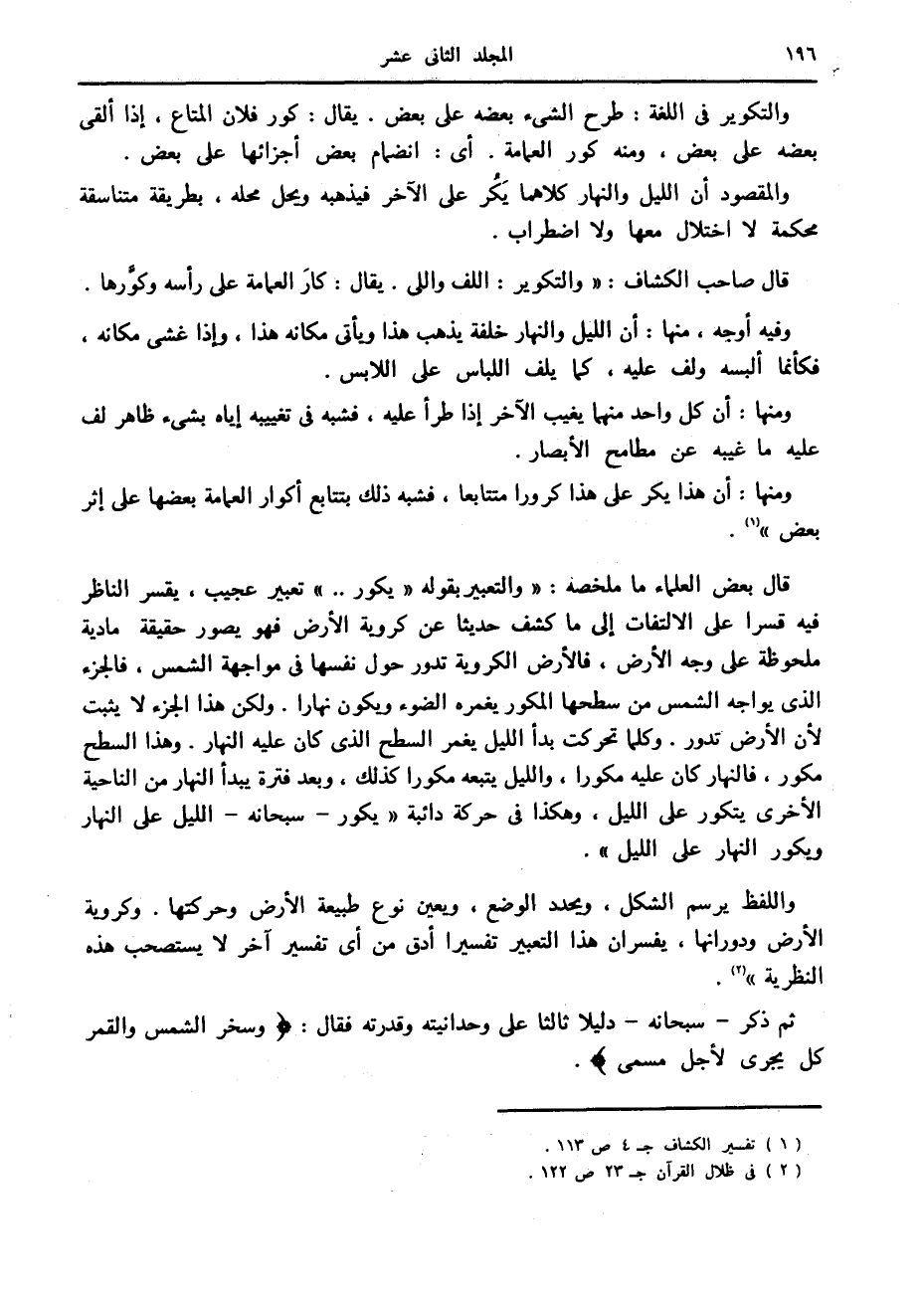 قال بعض العلماء ما ملخصه: «والتعبير بقوله «يكور..» تعبير عجيب، يقسر الناظر فيه قسرا على الالتفات إلى ما كشف حديثا عن كروية الأرض فهو يصور حقيقة مادية ملحوظة على وجه الأرض، فالأرض الكروية تدور حول نفسها في مواجهة الشمس، فالجزء الذي يواجه الشمس من سطحها المكور يغمره الضوء ويكون نهارا. ولكن هذا الجزء لا يثبت لأن الأرض تدور. وكلما تحركت بدأ الليل يغمر السطح الذي كان عليه النهار. وهذا السطح مكور، فالنهار كان عليه مكورا، والليل يتبعه مكورا كذلك، وبعد فترة يبدأ النهار من الناحية الأخرى يتكور على الليل، وهكذا في حركة دائبة «يكور- سبحانه- الليل على النهار ويكور النهار على الليل» .