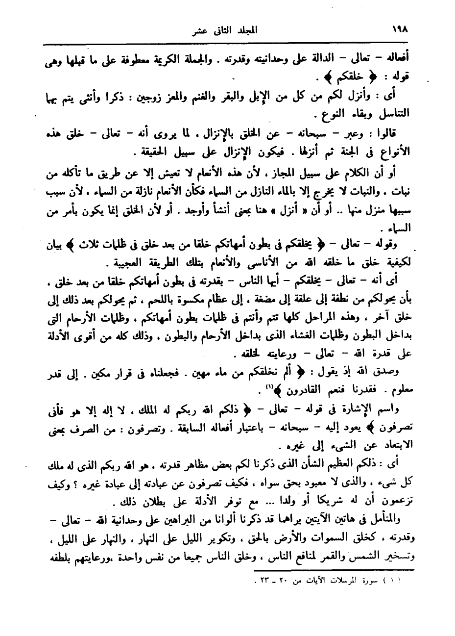 أو أن الكلام على سبيل المجاز، لأن هذه الأنعام لا تعيش إلا عن طريق ما تأكله من نبات، والنبات لا يخرج إلا بالماء النازل من السماء فكأن الأنعام نازلة من السماء، لأن سبب سببها منزل منها.. أو أن «أنزل» هنا بمعنى أنشأ وأوجد. أو لأن الخلق إنما يكون بأمر من السماء.