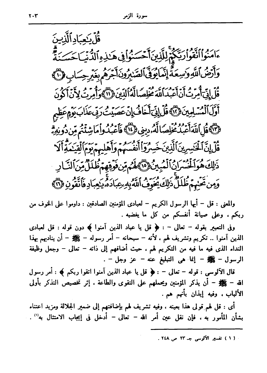 قُلْ يا عِبادِ الَّذِينَ آمَنُوا اتَّقُوا رَبَّكُمْ لِلَّذِينَ أَحْسَنُوا فِي هذِهِ الدُّنْيا حَسَنَةٌ وَأَرْضُ اللَّهِ واسِعَةٌ إِنَّما يُوَفَّى الصَّابِرُونَ أَجْرَهُمْ بِغَيْرِ حِسابٍ (10) قُلْ إِنِّي أُمِرْتُ أَنْ أَعْبُدَ اللَّهَ مُخْلِصاً لَهُ الدِّينَ (11) وَأُمِرْتُ لِأَنْ أَكُونَ أَوَّلَ الْمُسْلِمِينَ (12) قُلْ إِنِّي أَخافُ إِنْ عَصَيْتُ رَبِّي عَذابَ يَوْمٍ عَظِيمٍ (13) قُلِ اللَّهَ أَعْبُدُ مُخْلِصاً لَهُ دِينِي (14)