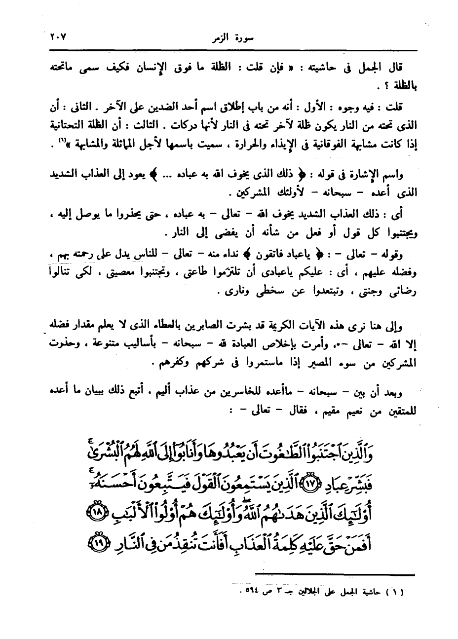 قال الجمل في حاشيته: «فإن قلت: الظلة ما فوق الإنسان فكيف سمى ما تحته بالظلة؟.