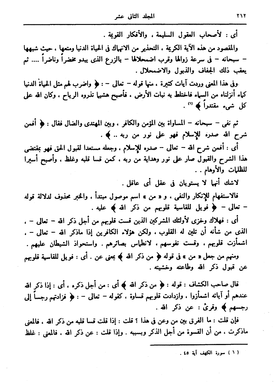 قال صاحب الكشاف: قوله: مِنْ ذِكْرِ اللَّهِ أى: من أجل ذكره، أى: إذا ذكر الله عندهم أو آياته اشمأزوا، وازدادت قلوبهم قساوة، كقوله- تعالى-: فَزادَتْهُمْ رِجْساً إِلَى رِجْسِهِمْ وقرئ: عن ذكر الله.