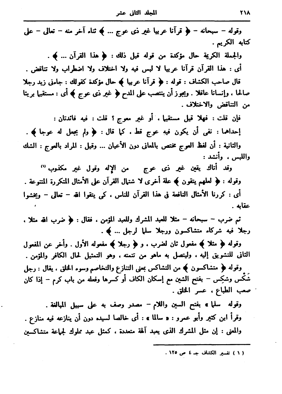 قال صاحب الكشاف: قوله: قُرْآناً عَرَبِيًّا حال مؤكدة كقولك: جاءني زيد رجلا صالحا، وإنسانا عاقلا. ويجوز أن ينتصب على المدح غَيْرَ ذِي عِوَجٍ أى: مستقيما بريئا من التناقض والاختلاف.