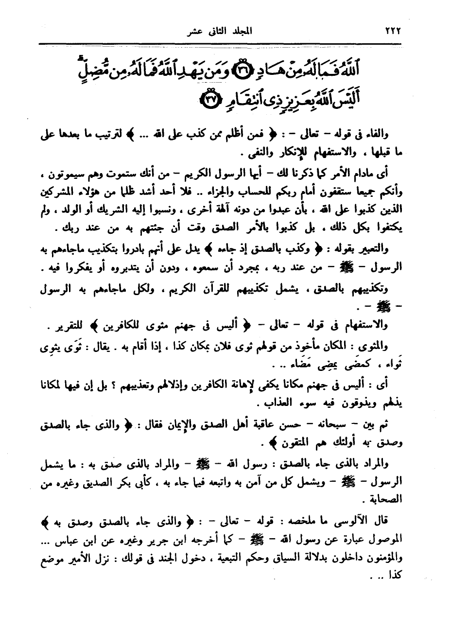 قال الآلوسى ما ملخصه: قوله- تعالى-: وَالَّذِي جاءَ بِالصِّدْقِ وَصَدَّقَ بِهِ الموصول عبارة عن رسول الله صلّى الله عليه وسلم كما أخرجه ابن جرير وغيره عن ابن عباس ...