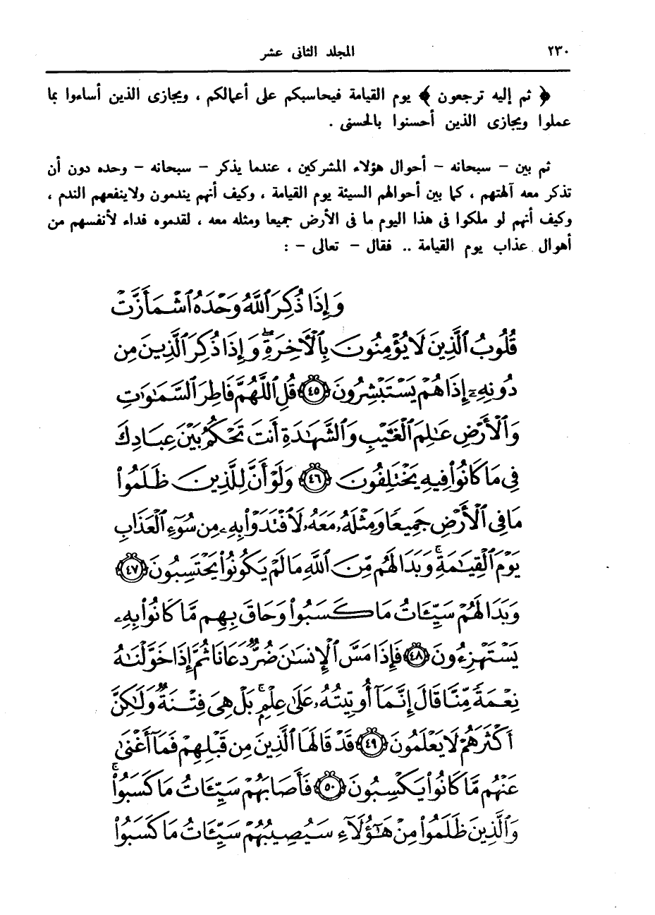 وَإِذا ذُكِرَ اللَّهُ وَحْدَهُ اشْمَأَزَّتْ قُلُوبُ الَّذِينَ لا يُؤْمِنُونَ بِالْآخِرَةِ وَإِذا ذُكِرَ الَّذِينَ مِنْ دُونِهِ إِذا هُمْ يَسْتَبْشِرُونَ (45) قُلِ اللَّهُمَّ فاطِرَ السَّماواتِ وَالْأَرْضِ عالِمَ الْغَيْبِ وَالشَّهادَةِ أَنْتَ تَحْكُمُ بَيْنَ عِبادِكَ فِي ما كانُوا فِيهِ يَخْتَلِفُونَ (46) وَلَوْ أَنَّ لِلَّذِينَ ظَلَمُوا ما فِي الْأَرْضِ جَمِيعاً وَمِثْلَهُ مَعَهُ لافْتَدَوْا بِهِ مِنْ سُوءِ الْعَذابِ يَوْمَ الْقِيامَةِ وَبَدا لَهُمْ مِنَ اللَّهِ ما لَمْ يَكُونُوا يَحْتَسِبُونَ (47) وَبَدا لَهُمْ سَيِّئاتُ ما كَسَبُوا وَحاقَ بِهِمْ ما كانُوا بِهِ يَسْتَهْزِؤُنَ (48) فَإِذا مَسَّ الْإِنْسانَ ضُرٌّ دَعانا ثُمَّ إِذا خَوَّلْناهُ نِعْمَةً مِنَّا قالَ إِنَّما أُوتِيتُهُ عَلى عِلْمٍ بَلْ هِيَ فِتْنَةٌ وَلكِنَّ أَكْثَرَهُمْ لا يَعْلَمُونَ (49)