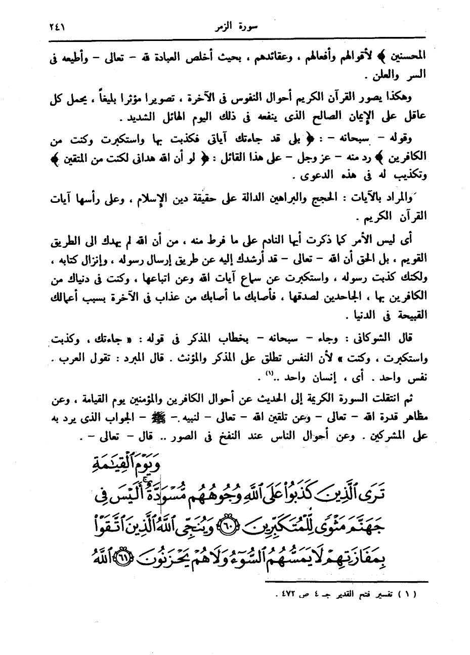ثم انتقلت السورة الكريمة إلى الحديث عن أحوال الكافرين والمؤمنين يوم القيامة، وعن مظاهر قدرة الله- تعالى- وعن تلقين الله- تعالى- لنبيه صلّى الله عليه وسلم الجواب الذي يرد به على المشركين. وعن أحوال الناس عند النفخ في الصور.. قال- تعالى-.