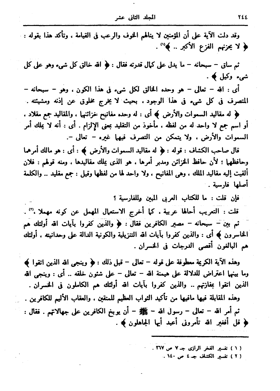 قال صاحب الكشاف: قوله: لَهُ مَقالِيدُ السَّماواتِ وَالْأَرْضِ: أى: هو مالك أمرهما وحافظهما لأن حافظ الخزائن ومدبر أمرها، هو الذي يملك مقاليدها، ومنه قولهم: فلان ألقيت إليه مقاليد الملك، وهي المفاتيح، ولا واحد لها من لفظها وقيل: جمع مقليد.. والكلمة أصلها فارسية.