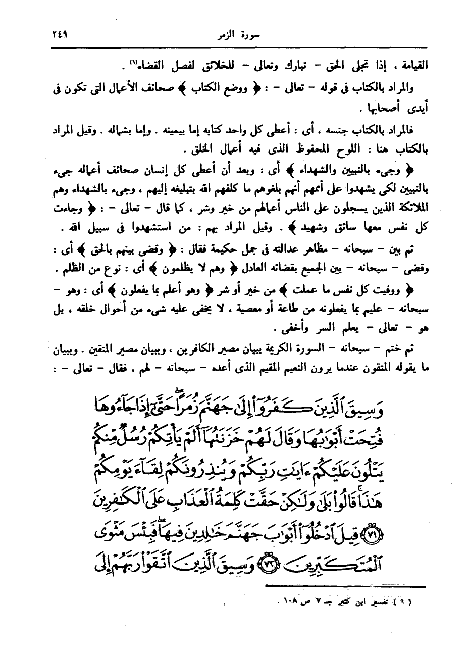 وَجِيءَ بِالنَّبِيِّينَ وَالشُّهَداءِ أى: وبعد أن أعطى كل إنسان صحائف أعماله جيء بالنبيين لكي يشهدوا على أممهم أنهم بلغوهم ما كلفهم الله بتبليغه إليهم، وجيء بالشهداء وهم الملائكة الذين يسجلون على الناس أعمالهم من خير وشر، كما قال- تعالى-: وَجاءَتْ كُلُّ نَفْسٍ مَعَها سائِقٌ وَشَهِيدٌ. وقيل المراد بهم: من استشهدوا في سبيل الله.