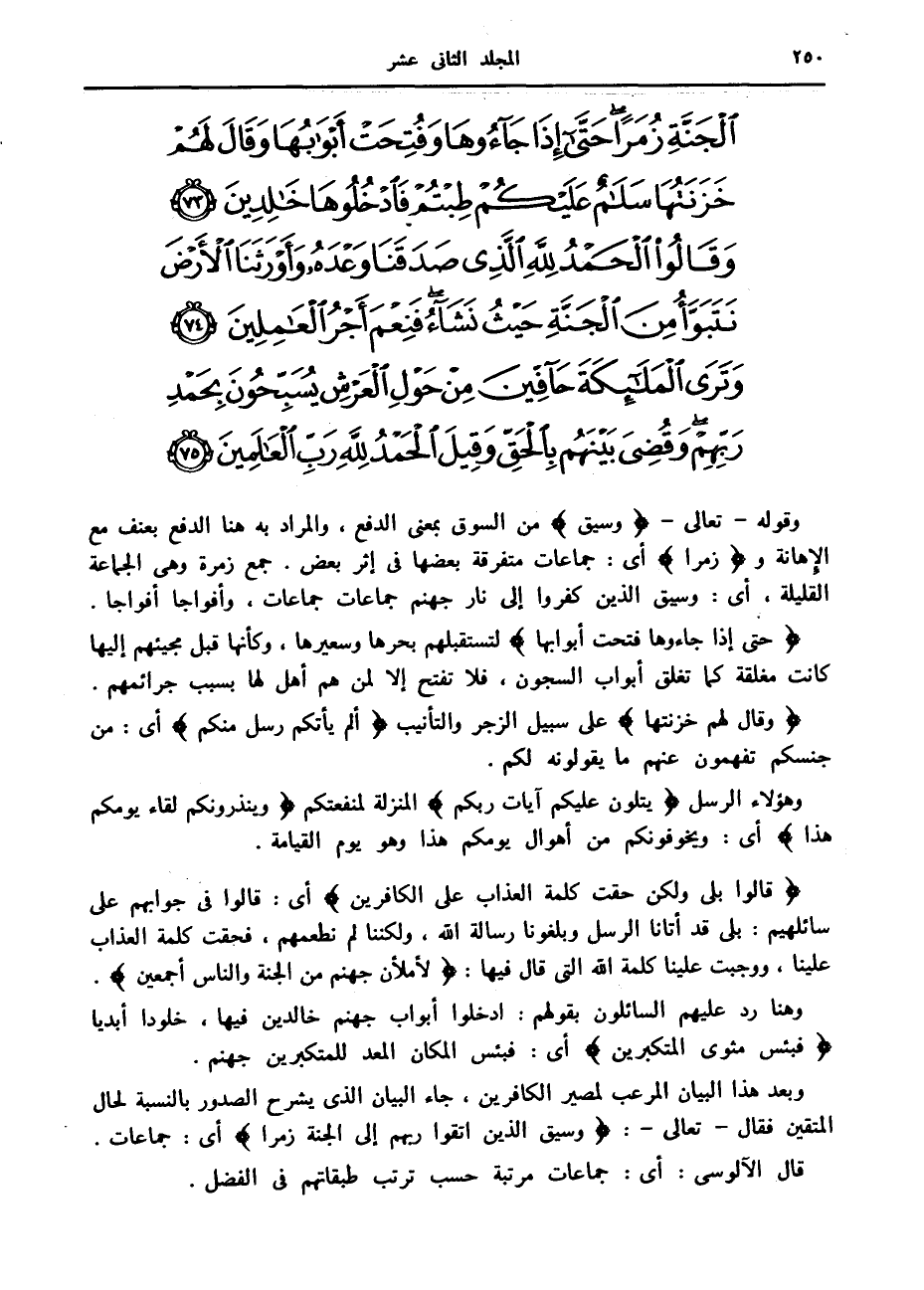 وبعد هذا البيان المرعب لمصير الكافرين، جاء البيان الذي يشرح الصدور بالنسبة لحال المتقين فقال- تعالى-: وَسِيقَ الَّذِينَ اتَّقَوْا رَبَّهُمْ إِلَى الْجَنَّةِ زُمَراً أى: جماعات.