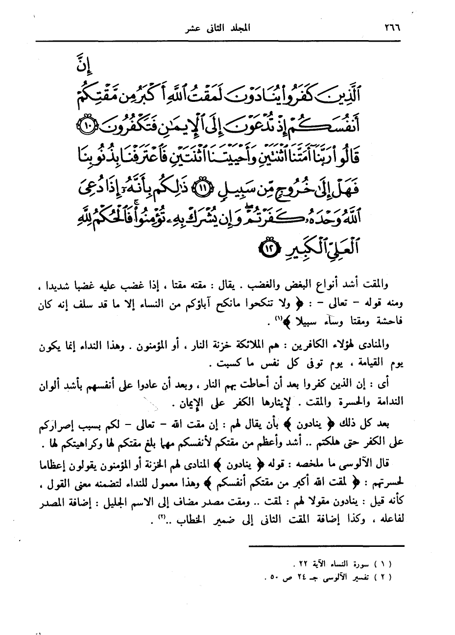 إِنَّ الَّذِينَ كَفَرُوا يُنادَوْنَ لَمَقْتُ اللَّهِ أَكْبَرُ مِنْ مَقْتِكُمْ أَنْفُسَكُمْ إِذْ تُدْعَوْنَ إِلَى الْإِيمانِ فَتَكْفُرُونَ (10) قالُوا رَبَّنا أَمَتَّنَا اثْنَتَيْنِ وَأَحْيَيْتَنَا اثْنَتَيْنِ فَاعْتَرَفْنا بِذُنُوبِنا فَهَلْ إِلى خُرُوجٍ مِنْ سَبِيلٍ (11) ذلِكُمْ بِأَنَّهُ إِذا دُعِيَ اللَّهُ وَحْدَهُ كَفَرْتُمْ وَإِنْ يُشْرَكْ بِهِ تُؤْمِنُوا فَالْحُكْمُ لِلَّهِ الْعَلِيِّ الْكَبِيرِ (12)
