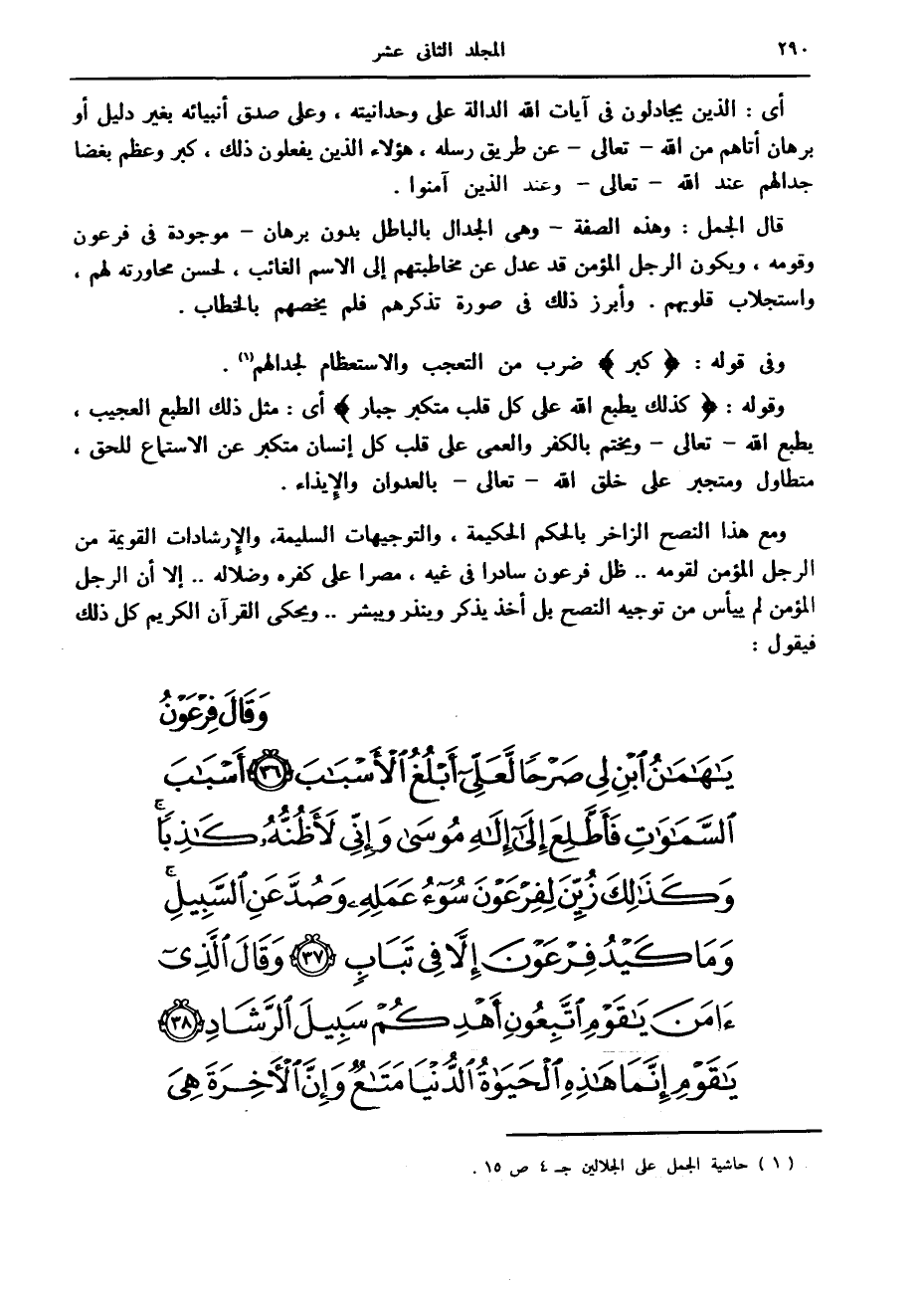 قال الجمل: وهذه الصفة- وهي الجدال بالباطل بدون برهان- موجودة في فرعون وقومه، ويكون الرجل المؤمن قد عدل عن مخاطبتهم إلى الاسم الغائب، لحسن محاورته لهم، واستجلاب قلوبهم. وأبرز ذلك في صورة تذكرهم فلم يخصهم بالخطاب.