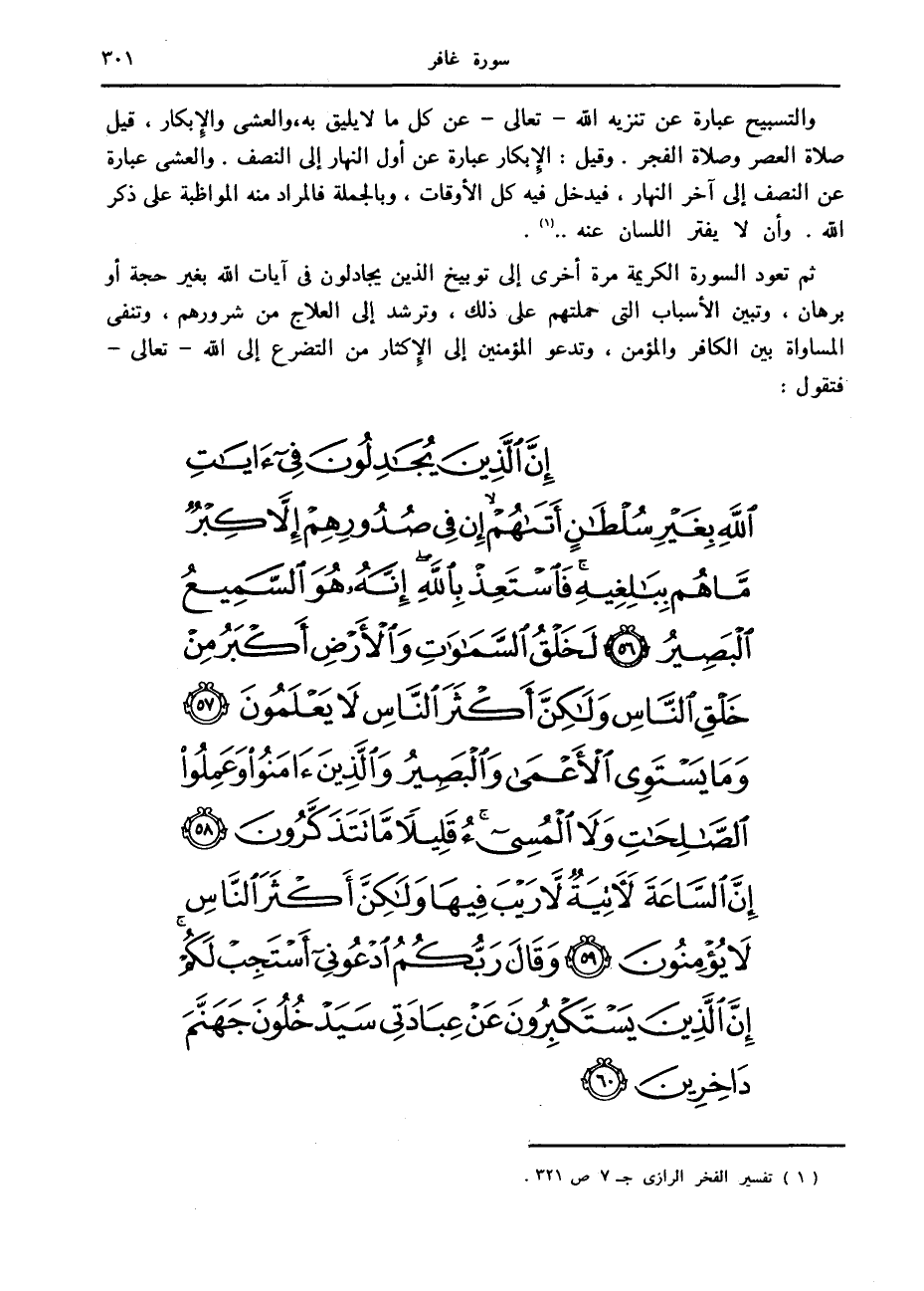 ثم تعود السورة الكريمة مرة أخرى إلى توبيخ الذين يجادلون في آيات الله بغير حجة أو برهان، وتبين الأسباب التي حملتهم على ذلك، وترشد إلى العلاج من شرورهم، وتنفى المساواة بين الكافر والمؤمن، وتدعو المؤمنين إلى الإكثار من التضرع إلى الله- تعالى- فتقول: