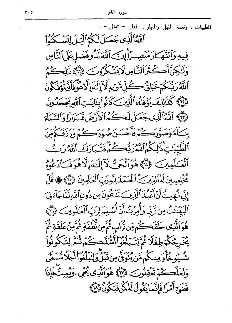 اللَّهُ الَّذِي جَعَلَ لَكُمُ اللَّيْلَ لِتَسْكُنُوا فِيهِ وَالنَّهارَ مُبْصِراً إِنَّ اللَّهَ لَذُو فَضْلٍ عَلَى النَّاسِ وَلكِنَّ أَكْثَرَ النَّاسِ لا يَشْكُرُونَ (61) ذلِكُمُ اللَّهُ رَبُّكُمْ خالِقُ كُلِّ شَيْءٍ لا إِلهَ إِلاَّ هُوَ فَأَنَّى تُؤْفَكُونَ (62) كَذلِكَ يُؤْفَكُ الَّذِينَ كانُوا بِآياتِ اللَّهِ يَجْحَدُونَ (63) اللَّهُ الَّذِي جَعَلَ لَكُمُ الْأَرْضَ قَراراً وَالسَّماءَ بِناءً وَصَوَّرَكُمْ فَأَحْسَنَ صُوَرَكُمْ وَرَزَقَكُمْ مِنَ الطَّيِّباتِ ذلِكُمُ اللَّهُ رَبُّكُمْ فَتَبارَكَ اللَّهُ رَبُّ الْعالَمِينَ (64) هُوَ الْحَيُّ لا إِلهَ إِلاَّ هُوَ فَادْعُوهُ مُخْلِصِينَ لَهُ الدِّينَ الْحَمْدُ لِلَّهِ رَبِّ الْعالَمِينَ (65)