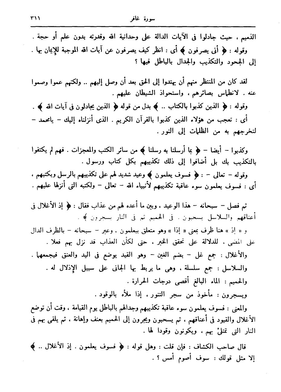 ثم فصل- سبحانه- هذا الوعيد، وبين ما أعده لهم من عذاب فقال: إِذِ الْأَغْلالُ فِي أَعْناقِهِمْ وَالسَّلاسِلُ يُسْحَبُونَ. فِي الْحَمِيمِ ثُمَّ فِي النَّارِ يُسْجَرُونَ.