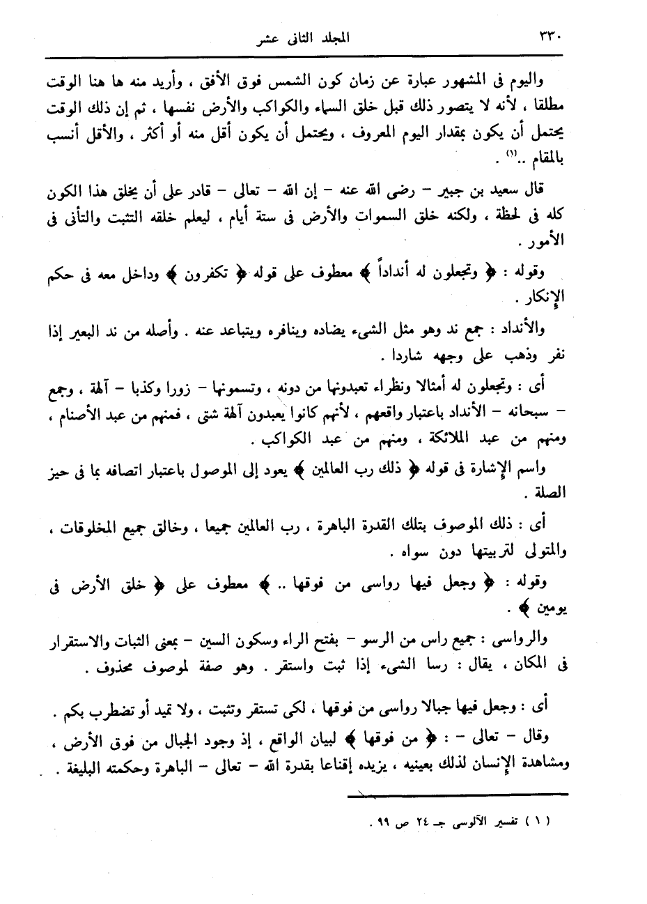 قال سعيد بن جبير- رضى الله عنه- إن الله- تعالى- قادر على أن يخلق هذا الكون كله في لحظة، ولكنه خلق السموات والأرض في ستة أيام، ليعلم خلقه التثبت والتأنى في الأمور.