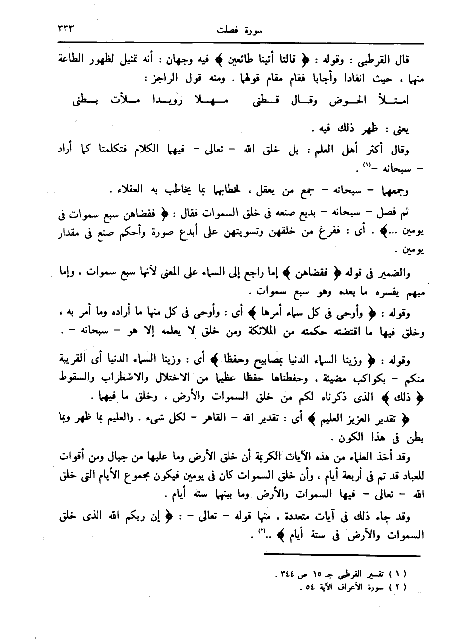 ثم فصل- سبحانه- بديع صنعه في خلق السموات فقال: فَقَضاهُنَّ سَبْعَ سَماواتٍ فِي يَوْمَيْنِ.... أى: ففرغ من خلقهن وتسويتهن على أبدع صورة وأحكم صنع في مقدار يومين.