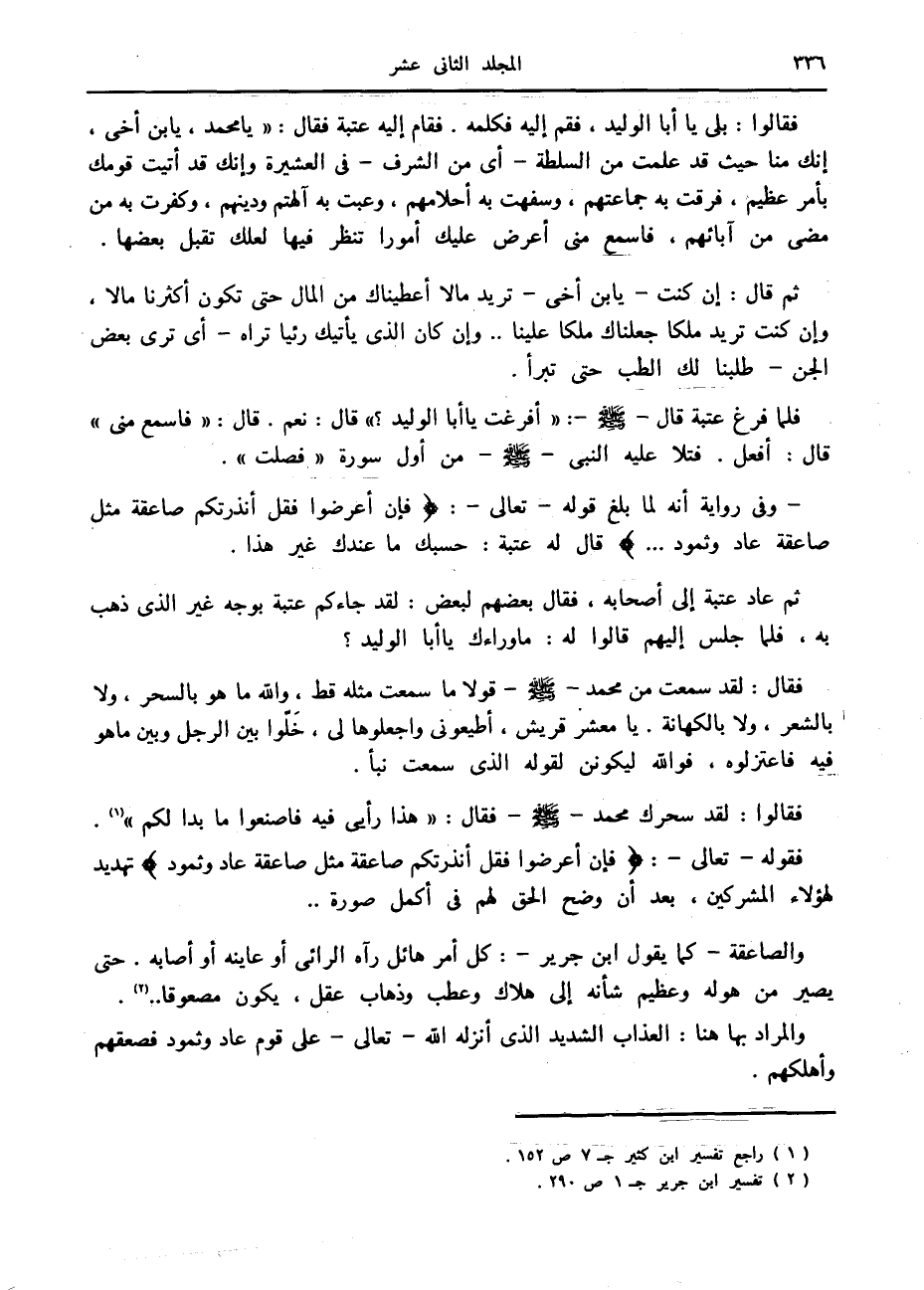 - وفي رواية أنه لما بلغ قوله- تعالى-: فَإِنْ أَعْرَضُوا فَقُلْ أَنْذَرْتُكُمْ صاعِقَةً مِثْلَ صاعِقَةِ عادٍ وَثَمُودَ ... قال له عتبة: حسبك ما عندك غير هذا.