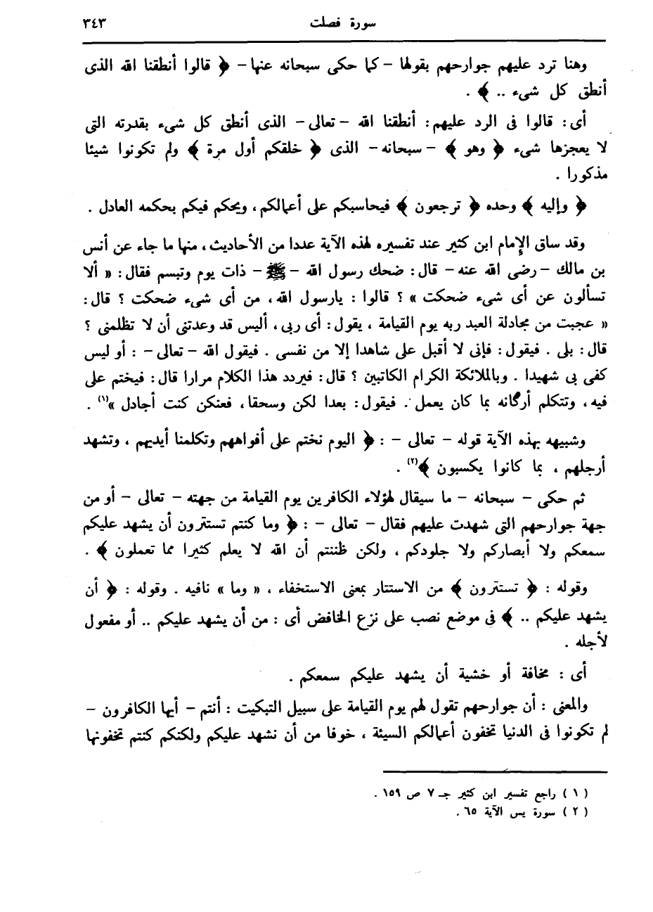 وهنا ترد عليهم جوارحهم بقولها- كما حكى سبحانه عنها- قالُوا أَنْطَقَنَا اللَّهُ الَّذِي أَنْطَقَ كُلَّ شَيْءٍ ...