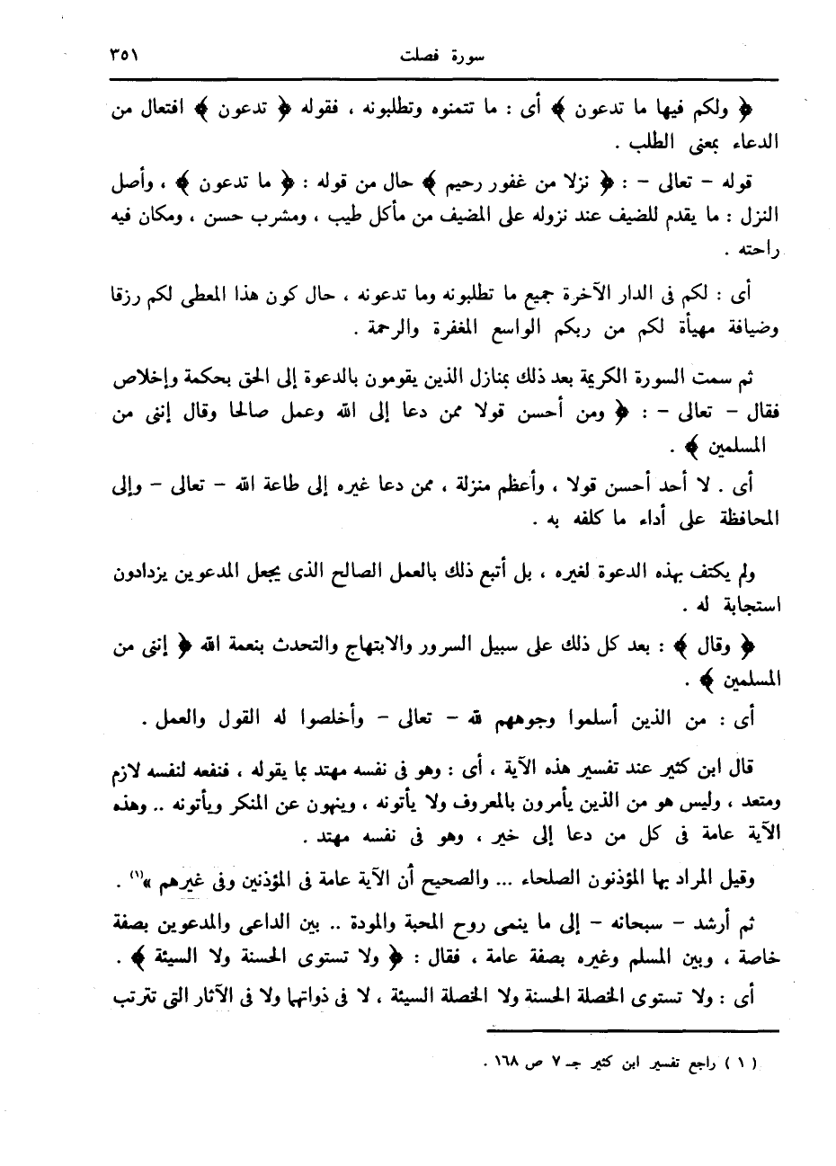 ثم سمت السورة الكريمة بعد ذلك بمنازل الذين يقومون بالدعوة إلى الحق بحكمة وإخلاص فقال- تعالى-: وَمَنْ أَحْسَنُ قَوْلًا مِمَّنْ دَعا إِلَى اللَّهِ وَعَمِلَ صالِحاً وَقالَ إِنَّنِي مِنَ الْمُسْلِمِينَ.