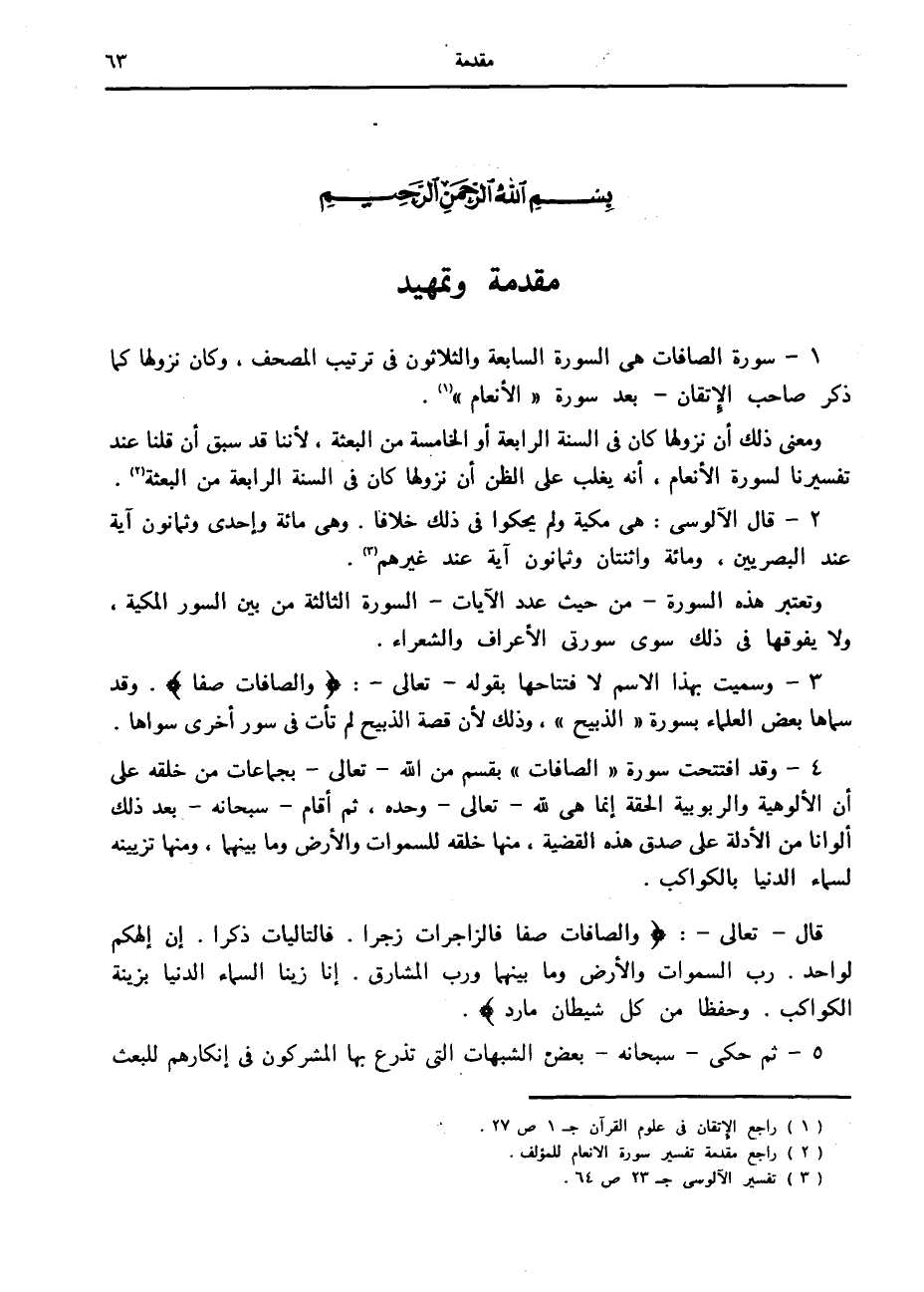 1- سورة الصافات هي السورة السابعة والثلاثون في ترتيب المصحف، وكان نزولها كما ذكر صاحب الإتقان- بعد سورة «الأنعام» «1» .