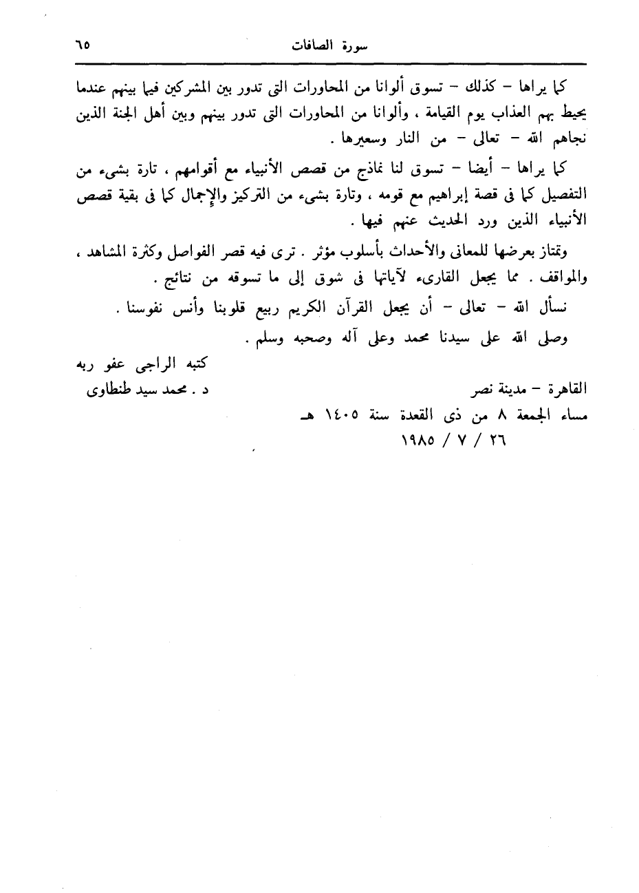 كتبه الراجي عفو ربه القاهرة- مدينة نصر د. محمد سيد طنطاوى مساء الجمعة 8 من ذي القعدة سنة 1405 هـ 26/ 7/ 1985