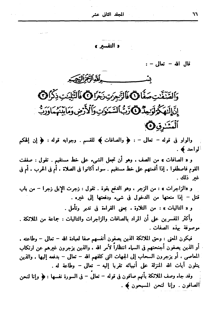 فيكون المعنى: وحق الملائكة الذين يصفون أنفسهم صفا لعبادة الله- تعالى- وطاعته، أو الذين يصفون أجنحتهم في السماء انتظارا لأمر الله، والذين يزجرون غيرهم عن ارتكاب المعاصي، أو يزجرون السحاب إلى الجهات التي كلفهم الله- تعالى- بدفعه إليها، والذين يتلون آيات الله المنزلة على أنبيائه تقربا إليه- تعالى- وطاعة له.