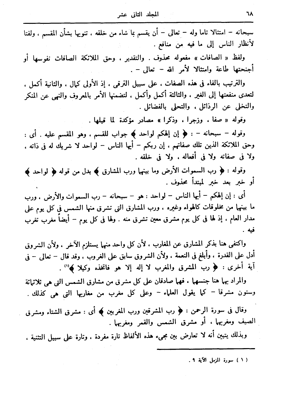 وقال في سورة الرحمن: رَبُّ الْمَشْرِقَيْنِ وَرَبُّ الْمَغْرِبَيْنِ أى: مشرق الشتاء ومشرق الصيف ومغربهما، أو مشرق الشمس والقمر ومغربهما.