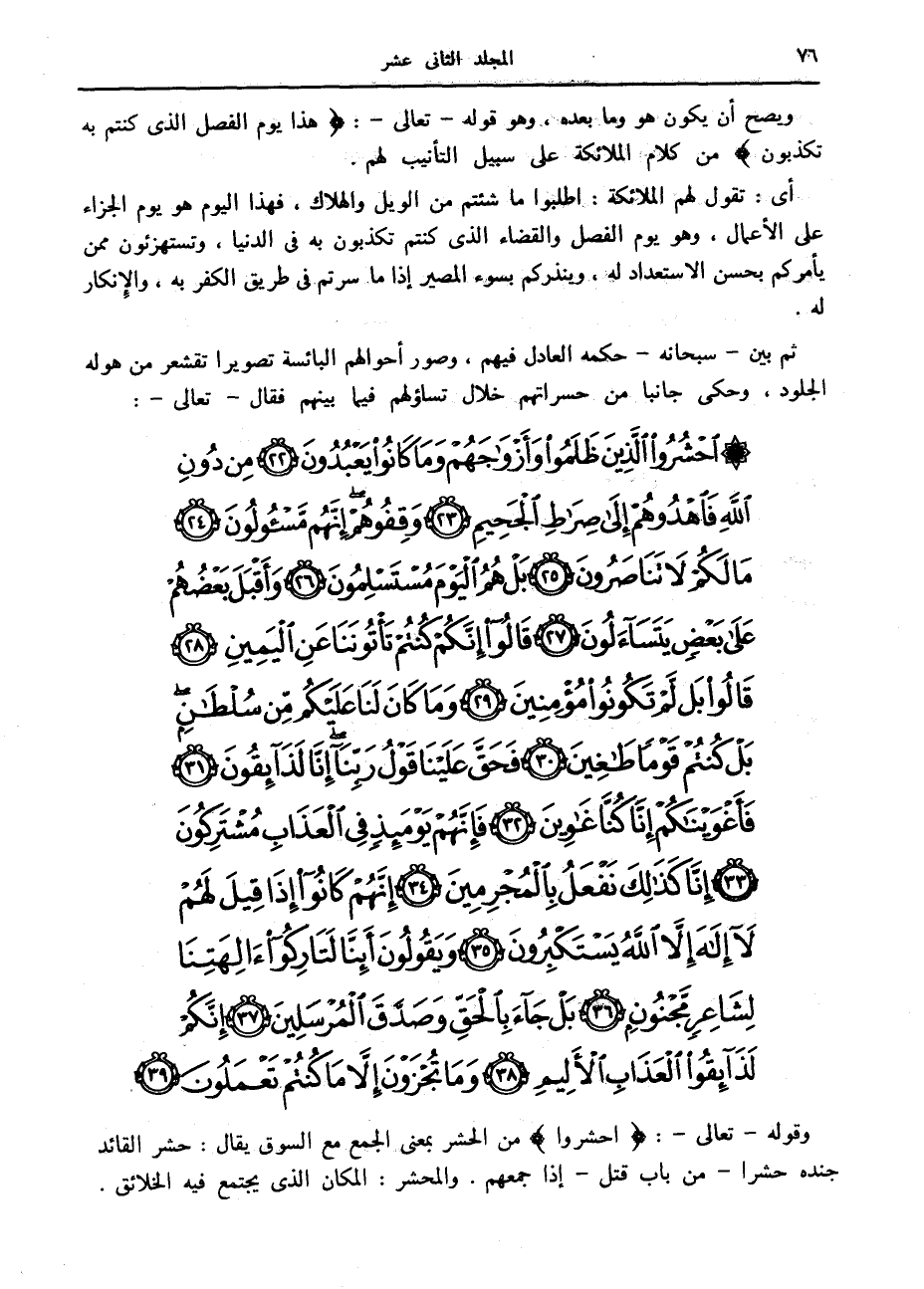 احْشُرُوا الَّذِينَ ظَلَمُوا وَأَزْواجَهُمْ وَما كانُوا يَعْبُدُونَ (22) مِنْ دُونِ اللَّهِ فَاهْدُوهُمْ إِلى صِراطِ الْجَحِيمِ (23) وَقِفُوهُمْ إِنَّهُمْ مَسْؤُلُونَ (24) ما لَكُمْ لا تَناصَرُونَ (25) بَلْ هُمُ الْيَوْمَ مُسْتَسْلِمُونَ (26)