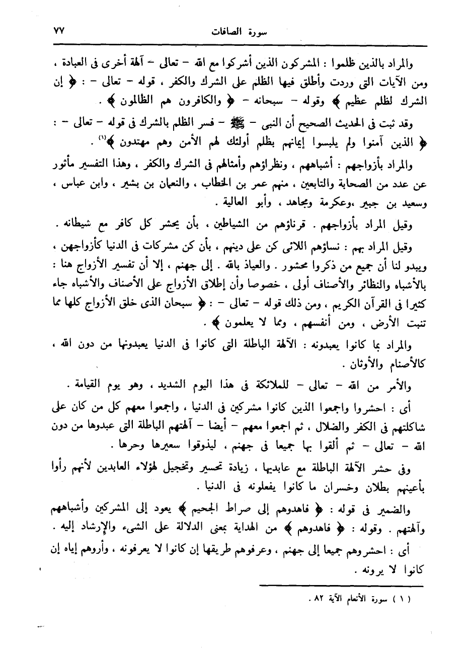 وقيل المراد بهم: نساؤهم اللائي كن على دينهم، بأن كن مشركات في الدنيا كأزواجهن، ويبدو لنا أن جميع من ذكروا محشور. والعياذ بالله. إلى جهنم، إلا أن تفسير الأزواج هنا: