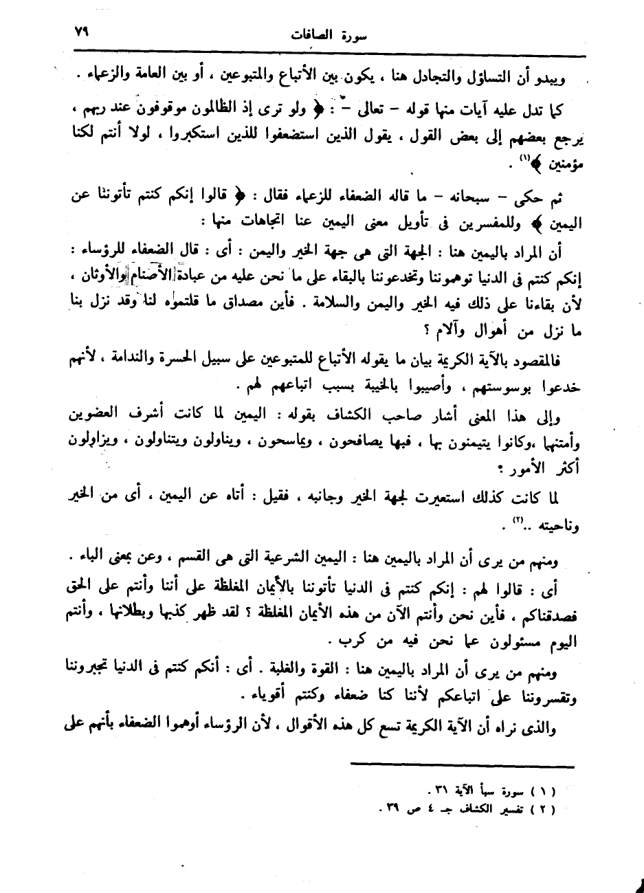 ثم حكى- سبحانه- ما قاله الضعفاء للزعماء فقال: قالُوا إِنَّكُمْ كُنْتُمْ تَأْتُونَنا عَنِ الْيَمِينِ وللمفسرين في تأويل معنى اليمين هنا اتجاهات منها: