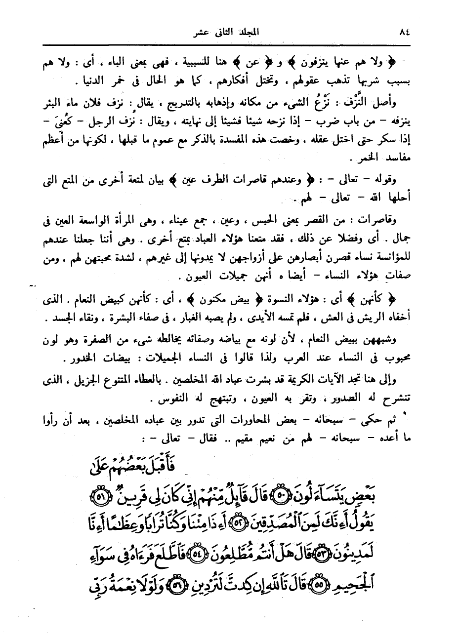 وقاصرات: من القصر بمعنى الحبس، وعين، جمع عيناء، وهي المرأة الواسعة العين في جمال. أى وفضلا عن ذلك، فقد متعنا هؤلاء العباد بمتع أخرى. وهي أننا جعلنا عندهم للمؤانسة نساء قصرن أبصارهن على أزواجهن لا يمدونها إلى غيرهم، لشدة محبتهن لهم، ومن صفات هؤلاء النساء- أيضا أنهن جميلات العيون.