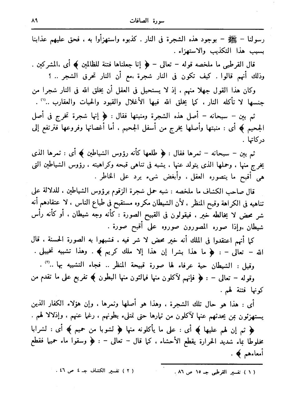 وكان هذا القول جهلا منهم، إذ لا يستحيل في العقل أن يخلق الله في النار شجرا من جنسها لا تأكله النار، كما يخلق الله فيها الأغلال والقيود والحيات والعقارب.. «1» .