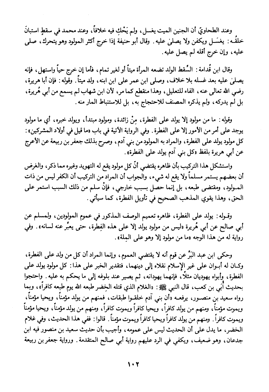 وحكى ابن عبد البَرَّ عن قوم أنه لا يقتضي العموم، وإنما المراد أن كل من ولد على الفطرة، وكان له أبوان على غير الإِسلام نقلاه إلى دينهما، فتقدير الخبر على هذا: كل مولود يولد على الفطرة، وأبواه يهوديان مثلًا، فإنهما يهودانه، ثم يصير عند بلوغه إلى ما يحكم به عليه. واحتجوا بحديث أُبَي بن كعب، قال النبي -صلى الله عليه وسلم-: "الغلام الذي قتله الخِضر طبعه الله يوم طبعه كافرًا"، وبما رواه سعيد بن منصور، يرفعه "أن بني آدم خلقوا طبقات، فمنهم من يولد مؤمنًا، ويحيا مؤمنًا، ويموت مؤمنًا، ومنهم من يولد كافرًا، ويحيا كافرًا ويموت كافرًا، ومنهم من يولد مؤمنًا، ويحيا مؤمنًا ويموت كافرًا. ومنهم من يولد كافرًا ويحيا كافرًا ويموت مؤمنًا. قالوا: ففي هذا الحديث، وفي غلام الخضر، ما يدل على أن الحديث ليس على عمومه، وأجيب بأن حديث سعيد بن منصور فيه ابن جدعان، وهو ضعيف، ويكفي في الرد عليهم رواية أبي صالح المتقدمة. ورواية جعفر بن ربيعة