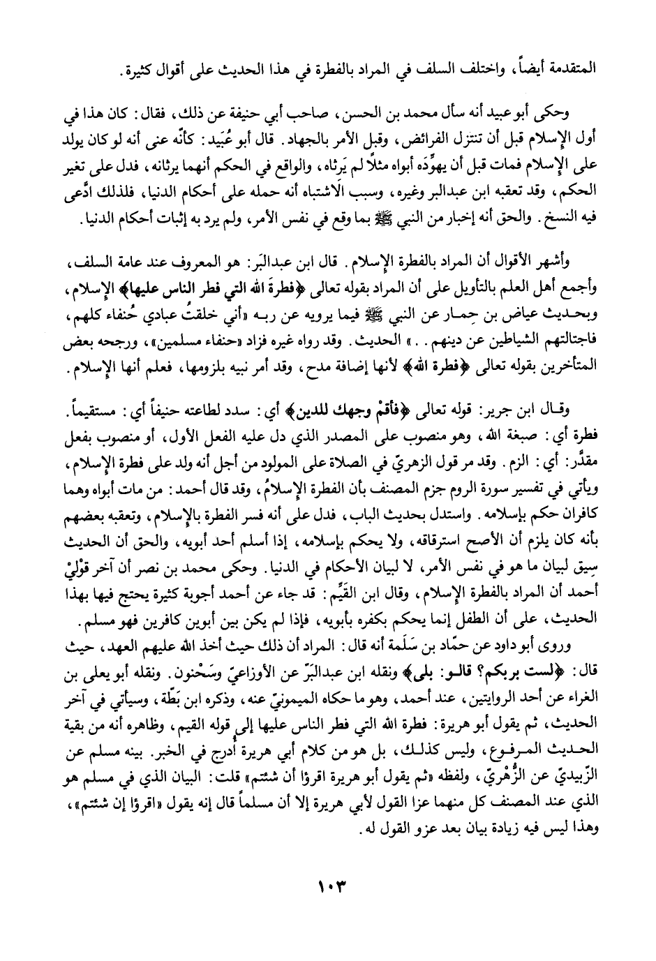 وأشهر الأقوال أن المراد بالفطرة الإِسلام. قال ابن عبد البَر: هو المعروف عند عامة السلف، وأجمع أهل العلم بالتأويل على أن المراد بقوله تعالى {فِطْرَتَ اللَّهِ الَّتِي فَطَرَ النَّاسَ عَلَيْهَا} الإِسلام، وبحديث عياض بن حِمار عن النبي -صلى الله عليه وسلم- فيما يرويه عن ربه "أني خلقتُ عبادي حُنفاء كلهم، فاجتالتهم الشياطين عن دينهم .. " الحديث. وقد رواه غيره فزاد "حنفاء مسلمين"، ورجحه بعض المتأخرين بقوله تعالى {فِطْرَتَ اللَّهِ} لأنها إضافة مدح، وقد أمر نبيه بلزومها، فعلم أنها الإِسلام.