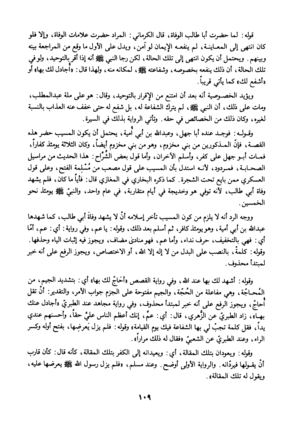 قوله: لما حضرت أبا طالب الوفاة، قال الكرماني: المراد حضرت علامات الوفاة، وإلا فلو كان انتهى إلى المعاينة، لم ينفعه الإِيمان لو آمن، ويدل على الأول ما وقع من المراجعة بينه وبينهم. ويحتمل أن يكون انتهى إلى تلك الحالة، لكن رجا النبي -صلى الله عليه وسلم- أنه إذا أقر بالتوحيد، ولو في تلك الحالة، أن ذلك ينفعه بخصوصه، وشفاعته -صلى الله عليه وسلم-، لمكانه منه، ولهذا قال: "أُجادل لك بها" أو "أشفع لك" كما يأتي قريبًا.