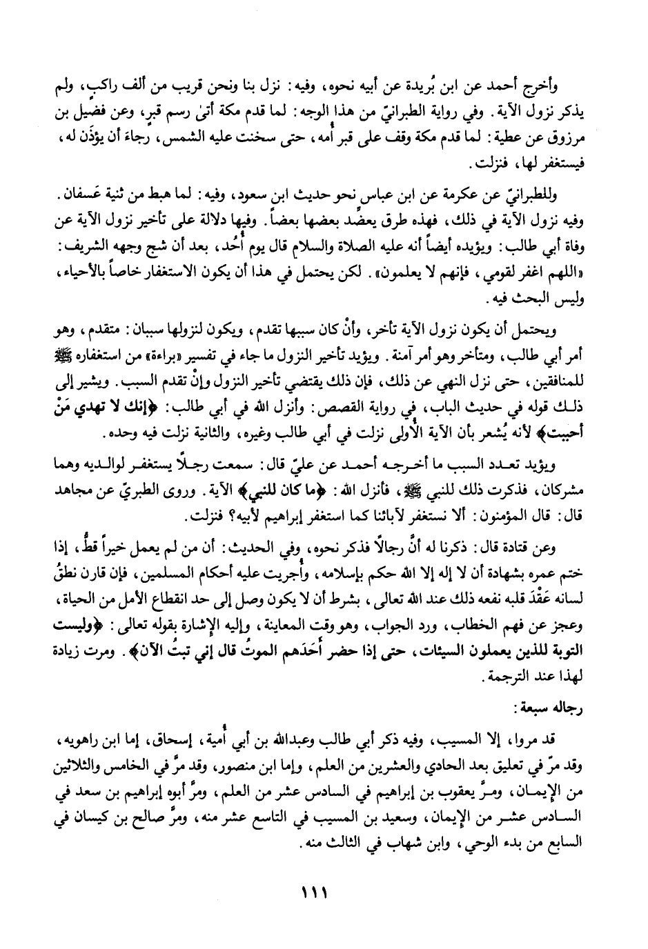 ويؤيد تعدد السبب ما أخرجه أحمد عن عليّ قال: سمعت رجلًا يستغفر لوالديه وهما مشركان، فذكرت ذلك للنبي -صلى الله عليه وسلم-، فأنزل الله: {مَا كَانَ لِلنَّبِيِّ} الآية. وروى الطبريّ عن مجاهد قال: قال المؤمنون: ألا نستغفر لآبائنا كما استغفر إبراهيم لأبيه؟ فنزلت.