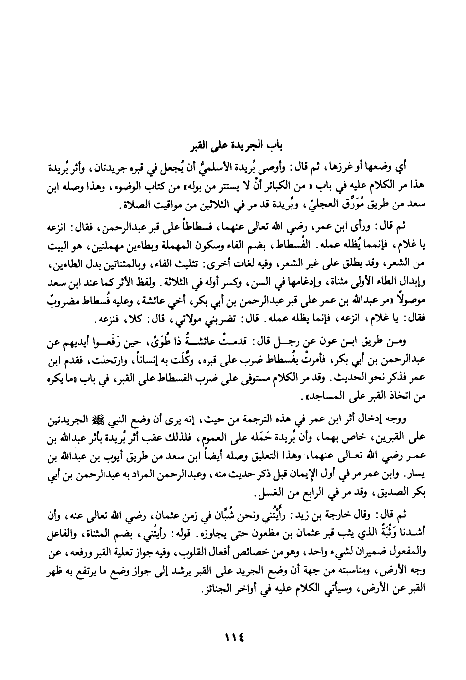 ووجه إدخال أثر ابن عمر في هذه الترجمة من حيث، إنه يرى أن وضع النبي -صلى الله عليه وسلم- الجريدتين على القبرين، خاص بهما، وأن بُريدة حَمَله على العموم، فلذلك عقب أثر بُريدة بأثر عبد الله بن عمر رضي الله تعالى عنهما، وهذا التعليق وصله أيضًا ابن سعد من طريق أيوب بن عبد الله بن يسار. وابن عمر مرَّ في أول الإِيمان قبل ذكر حديث منه، وعبد الرحمن المراد به عبد الرحمن بن أبي بكر الصديق، وقد مرَّ في الرابع من الغسل.