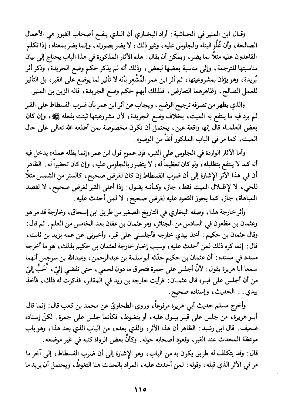 وقال ابن المنير في الحاشية: أراد البخاري أن الذي ينفع أصحاب القبور هي الأعمال الصالحة، وأن عُلُو البناء والجلوس عليه، وغير ذلك، لا يضر بصورته، وإنما يضر بمعناه، إذا تكلم القاعدون عليه مثلًا بما يضر، ويمكن أن يقال: هذه الآثار المذكورة في هذا الباب يحتاج إلى بيان مناسبتها للترجمة، وإلى مناسبة بعضها لبعض، وذلك أنه لم يذكر حكم وضع الجريدة، وذكر أثر بُريدة، وهو يؤذن بمشروعيتها، ثم أثر ابن عمر المُشْعِر بأنه لا تأثير لما يوضع على القبر، بل التأثير للعمل الصالح، وظاهرهما التعارض، فلذلك أبهم حكم وضع الجريدة، قاله الزين بن المنير.