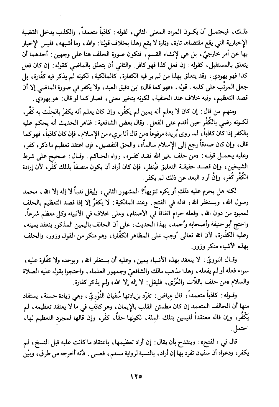 ومنهم من قال: إن كان لا يعلم أنه يمين لم يكفِّر، وإن كان يعلم أنه يكفرْ بالحِنْث به كَفَّر، لكونه رضي بالكُفْر حين أقدم على الفعل. وقال بعض الشافعية: ظاهر الحديث أنه يحكم عليه بالكفر إذا كان كاذبًا، لما روى بُريدة مرفوعًا "من قال أنا بريء من الإِسلام، فإن كان كاذبًا، فهو كما قال، وإن كان صادقًا رجع إلى الإِسلام سالمًا"، والحق التفصيل، فإن اعتقد تعظيم ما ذكر، كفر، وعليه يحمل قوله: "من حلف بغير الله فقد كفر"، رواه الحاكم. وقال: صحيح على شرط الشيخين، وإن قصد حقيقة التعليق فيُنظر، فإن كان أراد أن يكون متصفًا بذلك كَفَر, لأن إرادة الكُفْر كُفر، وإنْ أراد البعد عن ذلك لم يكفر.