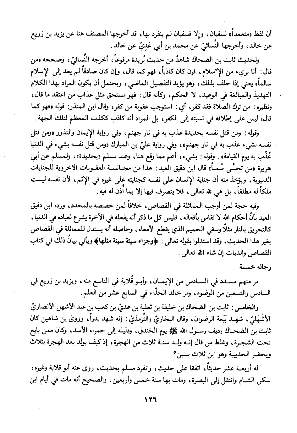 ولحديث ثابت بن الضحاك شاهدٌ من حديث بُريدة مرفوعًا، أخرجه النَّسائيّ، وصححه "من قال: أنا بريء من الإسلام، فإن كان كاذبًا، فهو كما قال، وإن كان صادقًا لم يعد إلى الإِسلام سالمًا" يعني إذا حلف بذلك، وهو يؤيد التفصيل الماضي، ويحتمل أن يكون المراد بهذا الكلام التهديدَ والمبالغة في الوعيد، لا الحكم، وكأنه قال: فهو مستحق مثل عذاب من اعتقد ما قال، ونظيره: من ترك الصلاة فقد كفر، أي: استوجب عقوبة من كفر، وقال ابن المنذر: قوله "فهو كما قال" ليس على إطلاقه في نسبته إلى الكفر، بل المراد أنه كاذب ككذب المعظم لتلك الجهة.