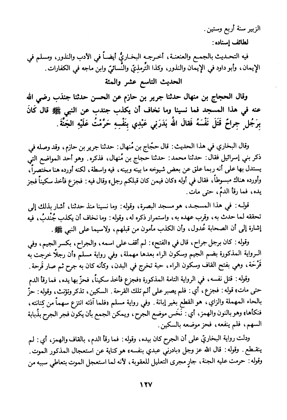 وَقَالَ حَجَّاجُ بْنُ مِنْهَالٍ حَدَّثَنَا جَرِيرُ بْنُ حَازِمٍ عَنِ الْحَسَنِ حَدَّثَنَا جُنْدَبٌ رضي الله عنه فِي هَذَا الْمَسْجِدِ فَمَا نَسِينَا، وَمَا نَخَافُ أَنْ يَكْذِبَ جُنْدَبٌ عَنِ النَّبِيِّ -صلى الله عليه وسلم- قَالَ كَانَ بِرَجُلٍ جِرَاحٌ فَقَتَلَ نَفْسَهُ فَقَالَ اللَّهُ بَدَرَنِي عَبْدِي بِنَفْسِهِ حَرَّمْتُ عَلَيْهِ الْجَنَّةَ.