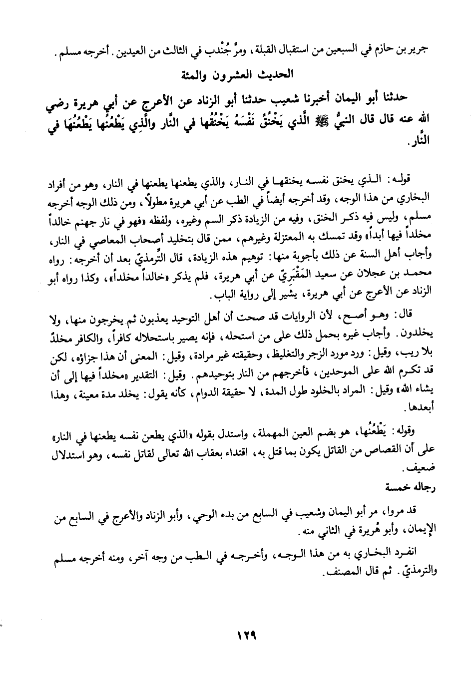 قوله: الذي يخنق نفسه يخنقها في النار، والذي يطعنها يطعنها في النار، وهو من أفراد البخاري من هذا الوجه، وقد أخرجه أيضًا في الطب عن أبي هريرة مطولًا، ومن ذلك الوجه أخرجه مسلم، وليس فيه ذكر الخنق، وفيه من الزيادة ذكر السم وغيره، ولفظه "فهو في نار جهنم خالدًا مخلدًا فيها أبدًا" وقد تمسك به المعتزلة وغيرهم، ممن قال بتخليد أصحاب المعاصي في النار، وأجاب أهل السنة عن ذلك بأجوبة منها: توهيم هذه الزيادة، قال التِّرمذيّ بعد أن أخرجه: رواه محمد بن عجلان عن سعيد المَقْبَرِيّ عن أبي هريرة، فلم يذكر "خالدًا مخلدًا"، وكذا رواه أبو الزناد عن الأعرج عن أبي هريرة، يشير إلى رواية الباب.